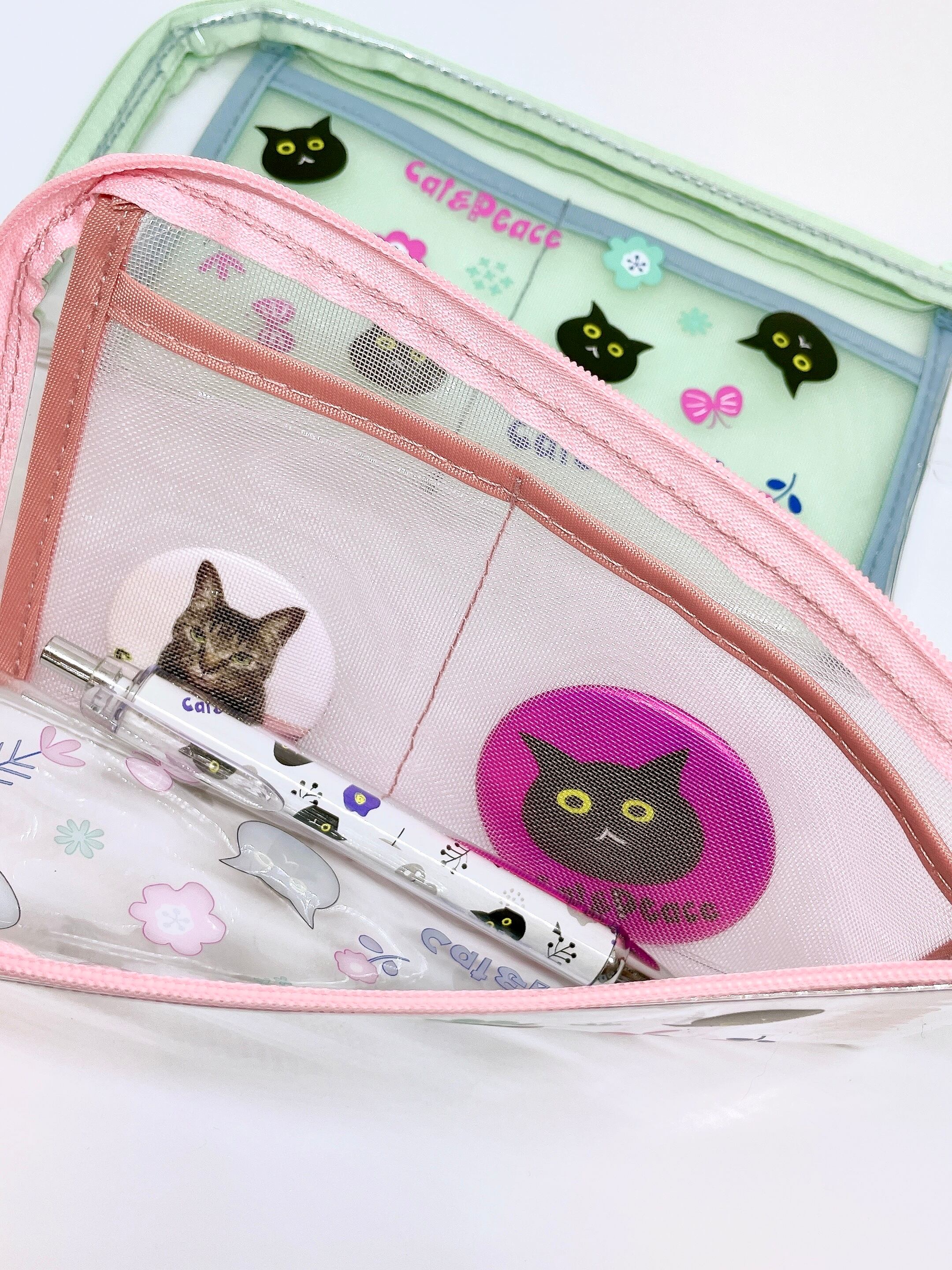 中身が見えるクリアなポーチなので、メッシュのポケットにかわいいものを入れてデコレーションも楽しめます。